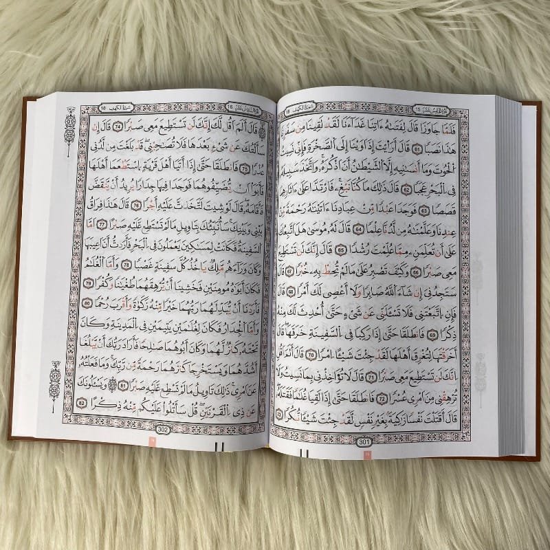 برواية ورش من طريق الأصبهاني وبحجم 17 × 24 سم، مصحف يساعد على تعلّم الترتيل.