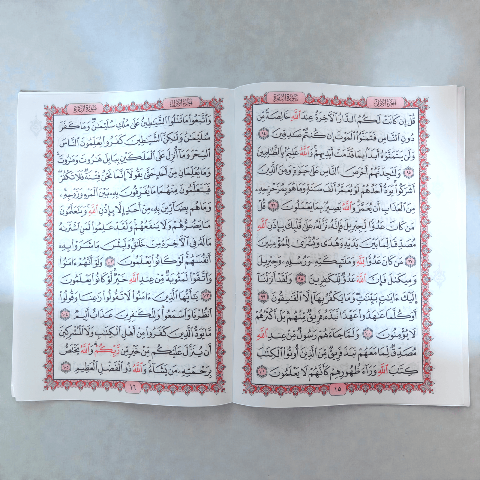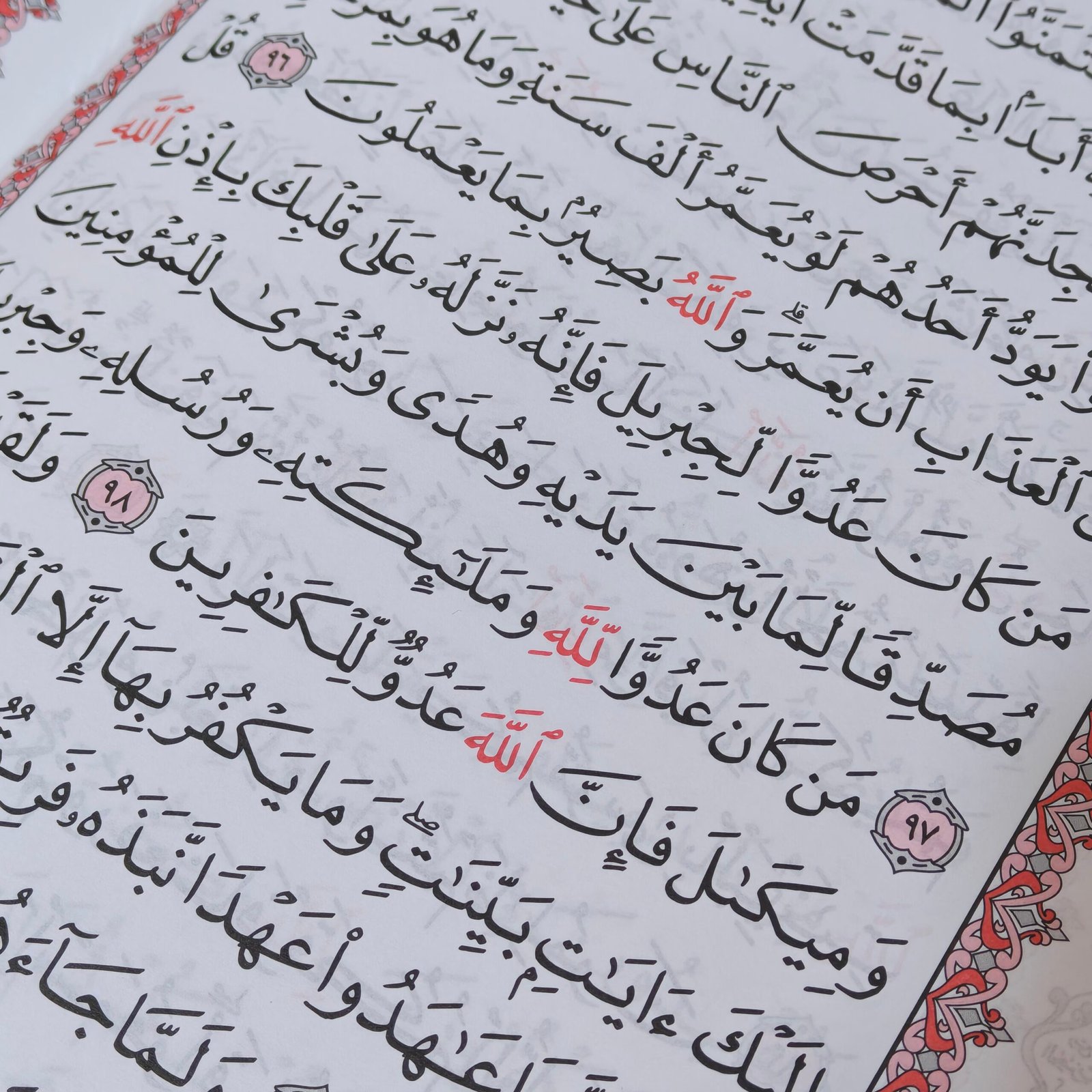 اعتماد اللونين الأبيض والأحمر في الطباعة يضمن وضوح النص وتوازن الصفحة، مع خط كبير يساعد على تقليل إجهاد العين وتحسين التركيز أثناء التلاوة.