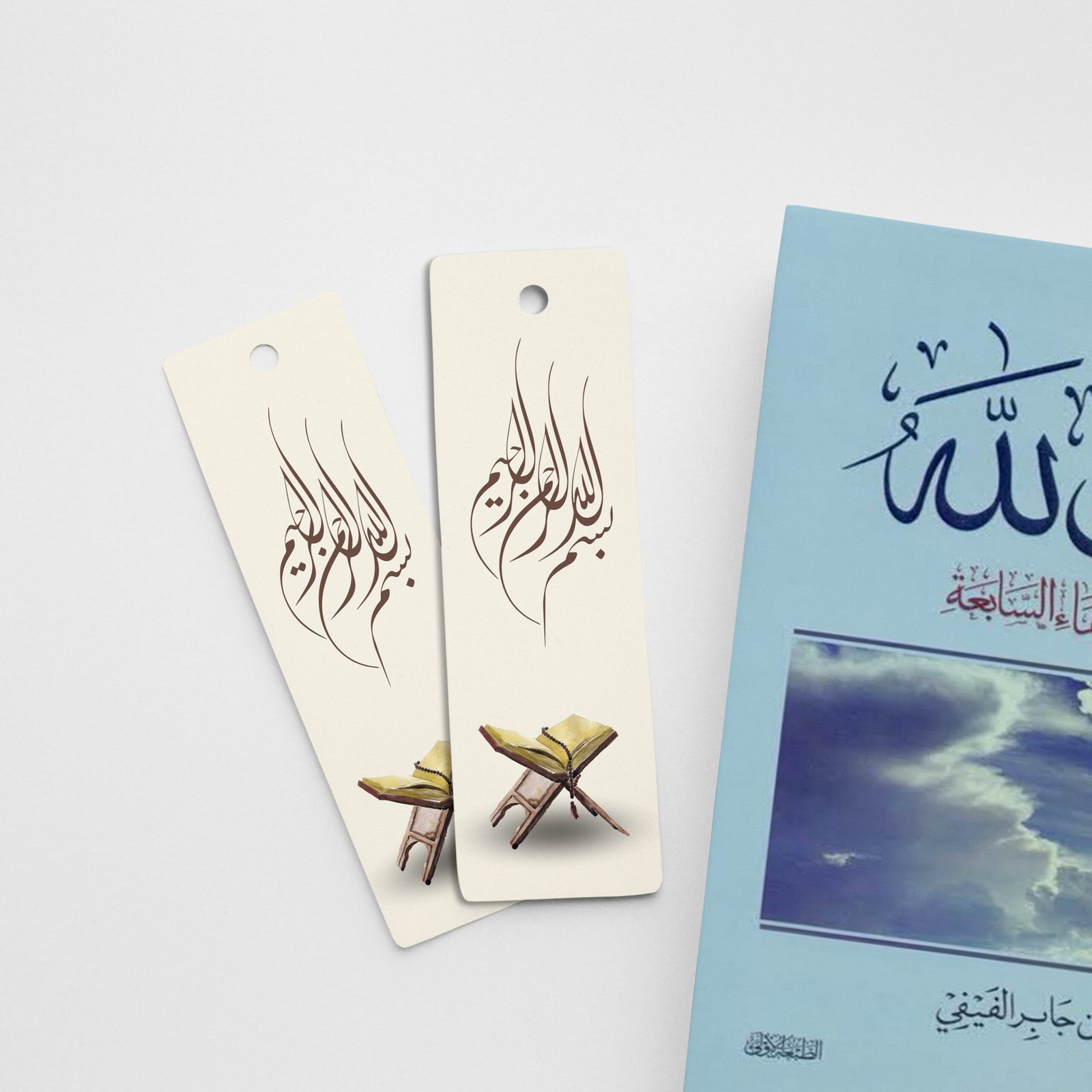 خلفية بلون بيج هادئ تنسجم مع جوّ الوقار، وفي الأسفل حاملة خشبية صغيرة تحمل مصحفًا مفتوحًا، بينما تعلوها عبارة “بسم الله الرحمن الرحيم” بخط عربي أصيل ومزخرف.