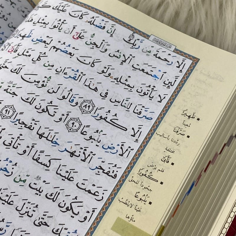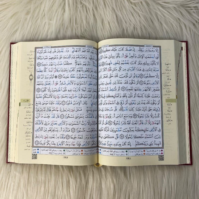 تم تمييز أحكام التجويد بألوان دقيقة داخل الآيات، لتسهيل الانتباه لمواضع القاعدة وتطبيقها مباشرة أثناء التلاوة، مع شروح مختصرة أسفل الصفحة تساعد على الفهم.