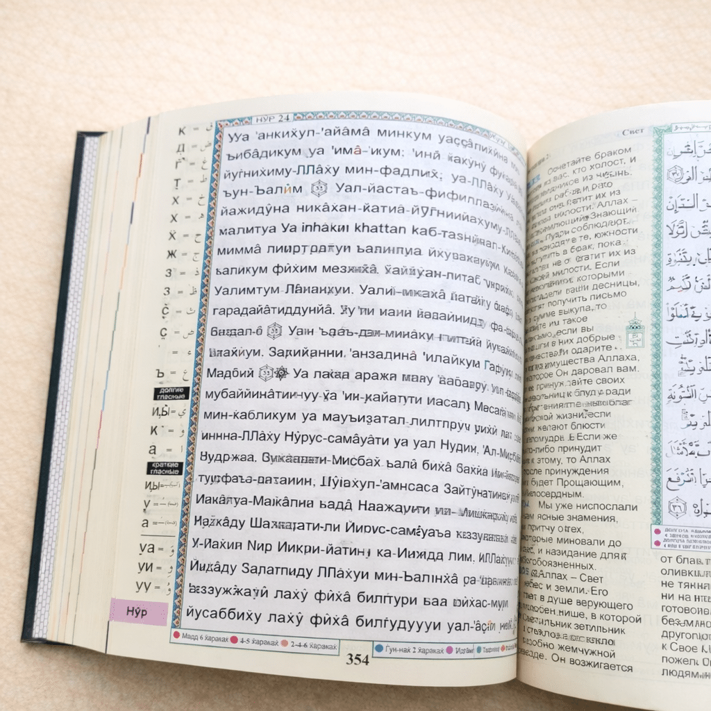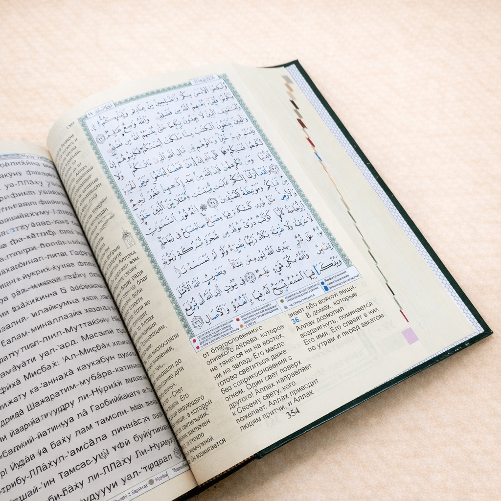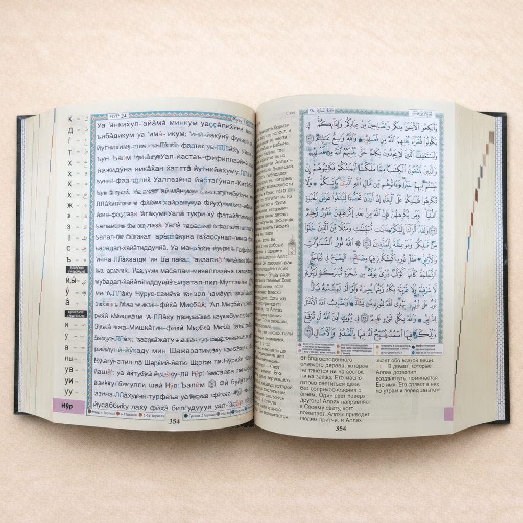 يجمع هذا المصحف بين نصّ القرآن الكريم مضبوطًا بأحكام التجويد، وترجمة معانيه باللغة الروسية، ليمنح القارئ تجربة قراءة متوازنة تجمع بين سلامة التلاوة ووضوح الفهم.